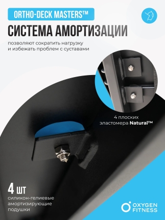 Дорожка обладает беговым полотном размером 130 см в длину и 46 см в ширину, выполненным из антискользящего материала толщиной 1.4 мм. Дека из МДФ с парафинированной поверхностью толщиной 15 мм обеспечивает надежную поддержку при занятиях. Также стоит отметить систему амортизации, состоящую из 4 силикон-гелиевых амортизирующих подушек ortho-Deck Masters™ и 4 плоских эластомеров Natural™, что значительно снижает нагрузку на суставы и делает тренировки более комфортными.