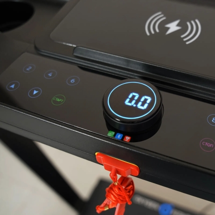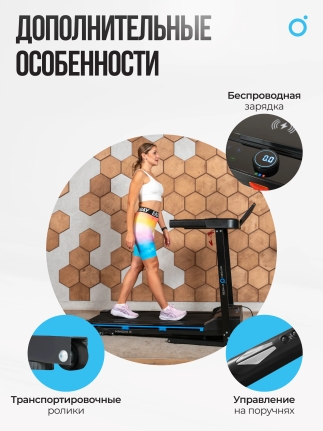Дополнительные функции MANGAN B включают подставку для планшета или смартфона, разъем USB с поддержкой зарядки, а также беспроводную зарядку для смартфонов. Система управления скоростью, расположенная на поручнях, позволяет пользователю удобно регулировать настройки во время тренировки, не отрываясь от процесса бега.