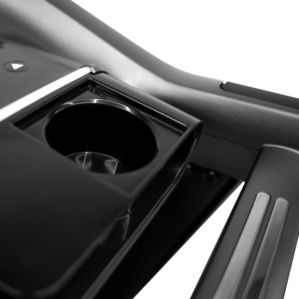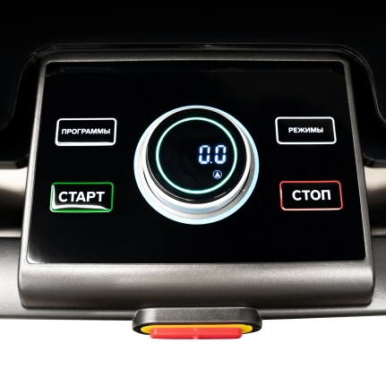 круглая кнопка на консоли, кнопки управления на поручнях (скорость и наклон), отсеки для аксессуаров