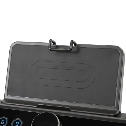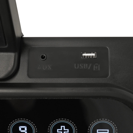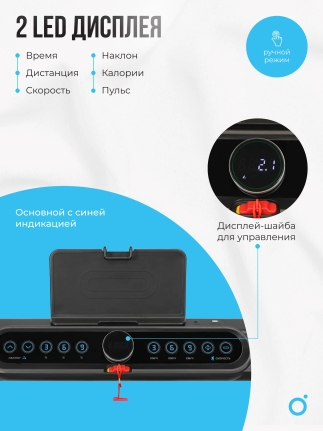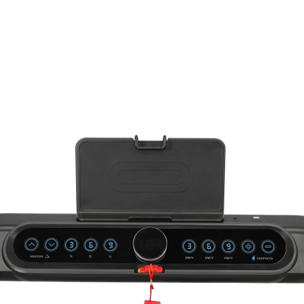 Консоль беговой дорожки оснащена LED-дисплеем с синей индикацией, который отображает ключевые показатели: время, скорость, дистанцию, калории и пульс. Пользователи могут регулировать угол наклона в 15 уровнях с помощью электронной системы. Дополнительно предусмотрены разъемы USB и AUX для зарядки смартфонов и подключения мультимедиа, а встроенные колонки создают атмосферу мотивации во время тренировок.