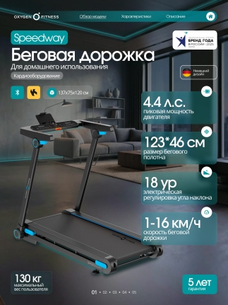 OXYGEN FITNESS SPEEDWAY — функциональная домашняя беговая дорожка с электронным углом наклона, продвинутой амортизацией и интерактивной интеграцией с Kinomap™. Бесщеточный двигатель 2.25 л.с. Fuji Electric (пиковая мощность 4.4 л.с.) обеспечивает стабильную и тихую работу.