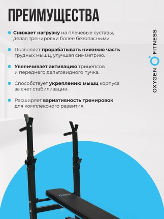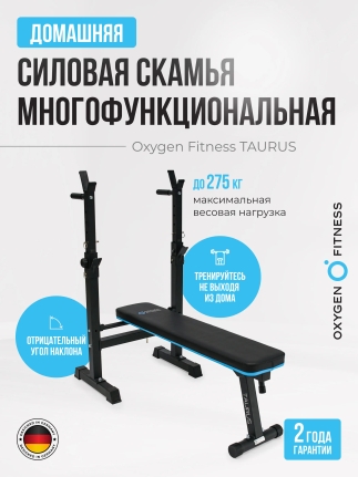 Многофункциональная силовая скамья OXYGEN FITNESS TAURUS — это идеальный выбор для тех, кто хочет эффективно заниматься спортом в домашних условиях. С помощью этого оборудования вы сможете выполнять широкий спектр силовых упражнений для всех групп мышц. Скамья сочетает в себе функциональность и компактный дизайн, что делает ее отличным дополнением к вашему домашнему тренажерному залу.