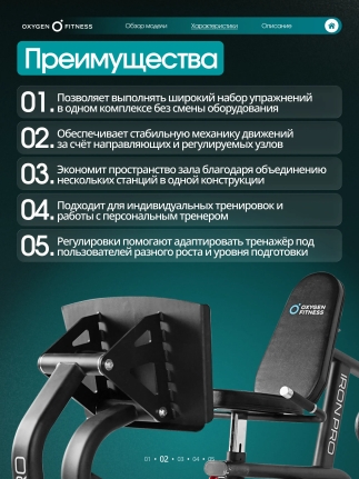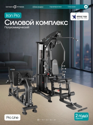 OXYGEN FITNESS IRON PRO — это универсальная силовая станция с расширенным функционалом и профессиональной надежностью. Она объединяет высокую прочность конструкции, плавную работу механизмов и комфортную эргономику, позволяя проводить полноценные силовые тренировки на одном тренажере.