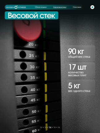 Эффективная грузоблочная система Система нагрузки реализована через грузоблочный стек 90 кг, состоящий из 17 композитных плит по 5 кг. Это позволяет точно подбирать уровень нагрузки и постепенно увеличивать рабочий вес по мере роста силы и выносливости.