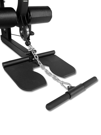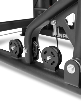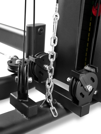 Усиленная конструкция для интенсивных тренировок Основу тренажера составляет прочная стальная рама из профиля 50 × 70 мм с толщиной стенки 2 мм, обеспечивающая высокую жесткость и устойчивость при любых нагрузках. Значительный вес конструкции 327 кг гарантирует стабильность тренажера даже при выполнении динамичных силовых упражнений.